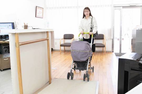 医院の入り口にはスロープを設置していますので、院内にはベビーカーでの乗り入れが可能です。玄関に少し段差がありますが、スムーズに移動できるように、スタッフがお手伝いします。